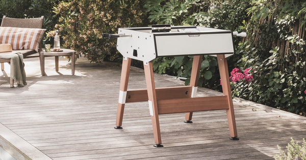 The Origin duo outdoor football table was developed in collaboration with Stella, a company based in the north of France. This model features a unique design and durability. Its small size means it can fit into even the tightest of spaces. Fewer players means faster games, with the ball constantly moving from one goal to the next. Its wooden legs, integrated into the body, give it finesse and elegance. Its pure, refined structure sets it apart from traditional table football. The Gerflex surface ensures excellent playing quality, and it has its own special features, such as oblique side strips for jumping balls and stainless steel goals that produce a distinctive sound when a goal is scored. Its robust design and the materials used mean it can withstand the toughest of shocks and weather conditions. Rain, snow and even extreme heat have no effect on it.
